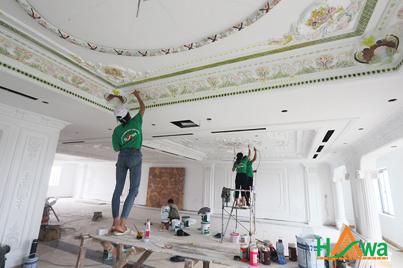 - Sơn phủ: Máy phun airless Graco Magnum X5 cho lớp mịn 50-80 micron. Tùy chọn dát vàng 24K (bằng lá vàng Ý) hoặc vẽ nhũ đồng 3D theo thiết kế.